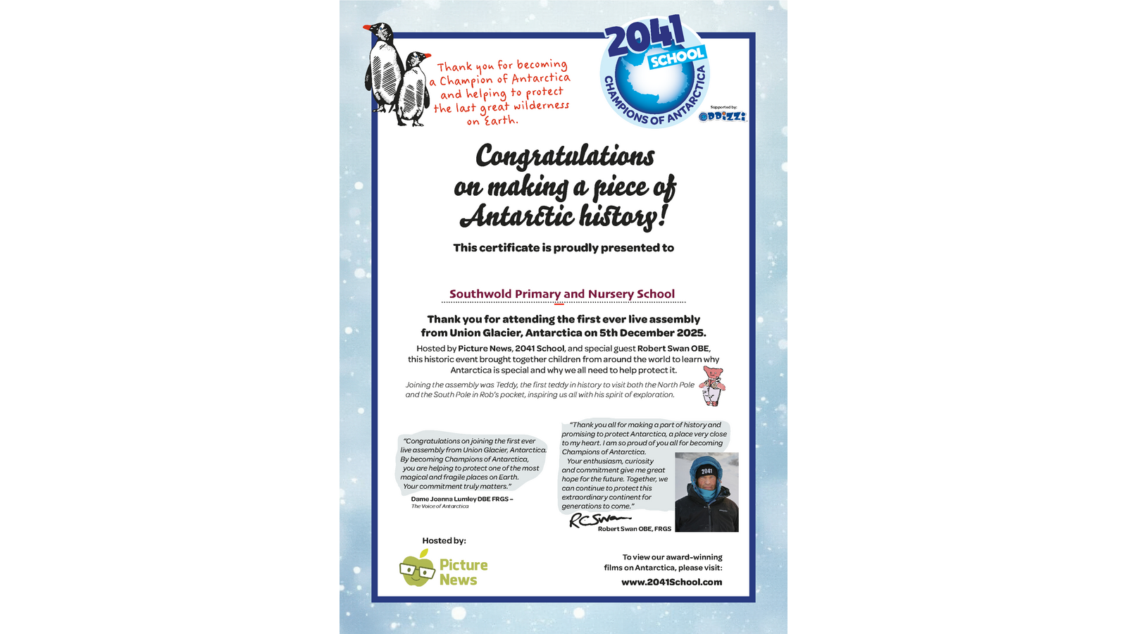 On Friday 5th December 2025, our school was lucky enough to join the first-ever live stream from Union Glacier in Antarctica. We were a part of making history...very exciting! Picture News, who helped Robert Swan OBE make contact with us all, estimated that 1,003,250 children watched this live! This is all part of a charity called 2041. It is called this because in 2041, the world, all the governments in the world, all the leaders in the world, are going to decide if we're going to leave Antarctica alone forever for science and peace and for our wildlife.
